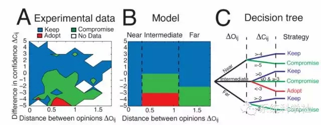 在文章《Social influence and the collectivedynamics of opinion formation》中,作者首先进行了两个实验(被试回答“How many goldmedals were awarded during the Olympics in China in 2008?”等类似的问题,同时汇报自信程度)以研究被试在接收到他人的回答及自信程度时如何改变自己的回答及自信程度。基于59个被试对于15个问题的回答结果,作者绘制了影响地图(influence map)以描述他人影响的作用。之后,作者基于实验得到的影响地图假设了一个决策树过程以模拟在多次相互影响下群体观点的形成或分化现象。模拟发现了影响群体观点的两个主要因素——专家效应及从众效应,同时也发现了两个效应之间转换的临界点。