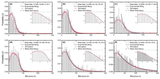 无论初始的投标分布如何,经过足够长的时间后系统会达到一个相当稳定的动态平衡。我们进行了平均场分析得到了和多个体模拟一致的结果,还证明了尾段的指数下降现象(这个现象在一些实证工作的文章中被提及而没有解决)。理论和实证结果的比较如下图,图中灰色柱状图为实际分布,红圈为多个体模型模拟的结果,蓝色虚线为平均场分析结果,黑色实线是对实证数据尾部的指数拟合。相比以前的模型,文章提出的向胜利者学习的机制显得更加合理(向更高收益者学习是人类的基本行为模式),并且该假设从实际数据的分析中获得支持(感谢Filippo Radicchi所提供的数据)。最后还值得突出说明的是,模型只有一个参数(学习率p),但获得了更好的整体拟合效果。