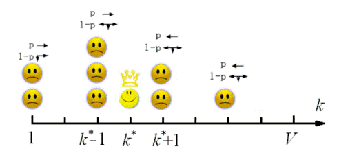 文章提出了一个具有学习效应的多主体模型,物理上可以看作多个粒子在一定随机驱动情况下的有界范围内的随机行走。模型框架如下图所示,每个个体以一定的概率p向胜利者前进一步(多步也可以,或者某一个分布);1-p的概率进行随机行走。个体的投标是离散的并被限制在一个有限区间(不能比1小,不能比标的物品的价格V多)。