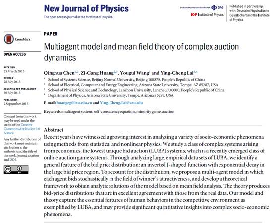 由我院陈清华副教授、王有贵教授和亚利桑那州立大学来颖诚教授、兰州大学黄子罡教授合作研究的“Multiagent model and mean field theory of complex auction dynamics”已被《New Journal of Physics》接受并于9月2日刊出。