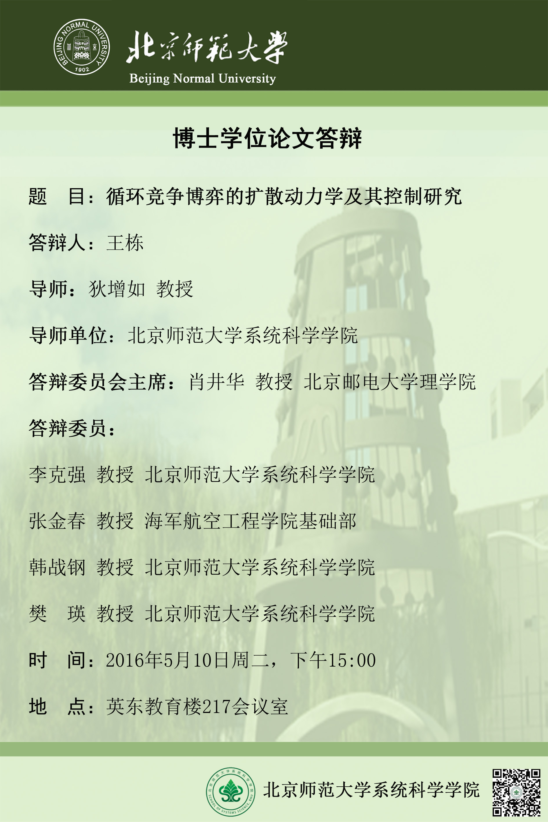 [博士答辩] 循环竞争博弈的扩散动力学及其控制研究