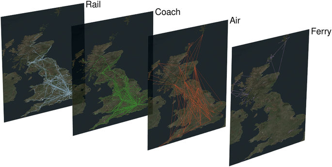 该数据集使得对国家层面上的公共交通网络的特点进行研究成为可能:城市间通过铁路、航空和长途汽车进行连接,航空飞机和轮渡连接着主要大陆和北小岛以及赫布里底群岛。地铁和公交车在这里没有展示。