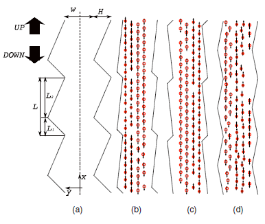 In the present work, we show that corridors with asymmetrically profiled walls can induce organization in the flow of pedestrians. Precisely, the key element of our approach is to use walls having the geometry of a ratchet, in the present work, we show that corridors with asymmetrically profiled walls can induce organization in the flow of pedestrians. Precisely, the key element of our approach is to use walls having the geometry of a ratchet, i.e., a zigzag structure such as the one shown in Fig. 1(a).We consider that all pedestrians (modeled here as self-driven particles) in the channel are identical except that half of them are downward movers, i.e., driven by a force downward, while the other half are upward movers, i.e., driven by a force upward. These forces try to impose a constant drift velocity. A repulsive potential acts between particles and with the walls, while a stochastic force introduces disorder. The flow orientation along the walls strongly depends on the system’s parameters. Moreover, as we will see later, increasing the strength of the disorder may suppress organization.
