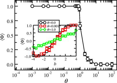 FIG. 5.Average order parameter as a function of θ, for ρ=0.6, b=8, vd=6, and H=2. The inset shows the crossover from ⟨Φ⟩=−1 to ⟨Φ⟩=1 as b changes from −8 to 8, for different values of θ.