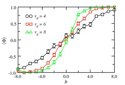 as a function of the asymmetry parameter b, for three different values of the drift velocity. We see that order is only induced for