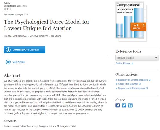 4 Hu R, Guo J, Chen Q, et al. The Psychological Force Model for Lowest Unique Bid Auction. Computational Economics, 2016(//link.springer.com/article/10.1007/s10614-016-9614-z?view=classic)