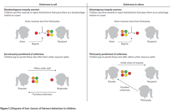 Abstract: New behavioural and neuroscientific evidence on the development of fairness behaviours demonstrates that the signatures of human fairness can be traced into childhood. Children make sacrifices for fairness (1) when they have less than others, (2) when others have been unfair and (3) when they have more than others. The latter two responses mark a critical departure from what is observed in other species because they enable fairness to be upheld even when doing so goes against self-interest. This new work can be fruitfully combined with insights from cognitive neuroscience to understand the mechanisms of developmental change.